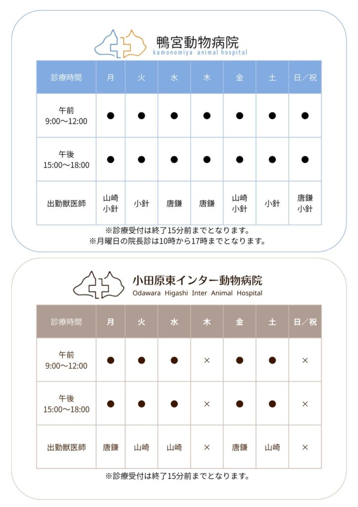 本院・分院それぞれの診療時間および担当獣医師につきましては、